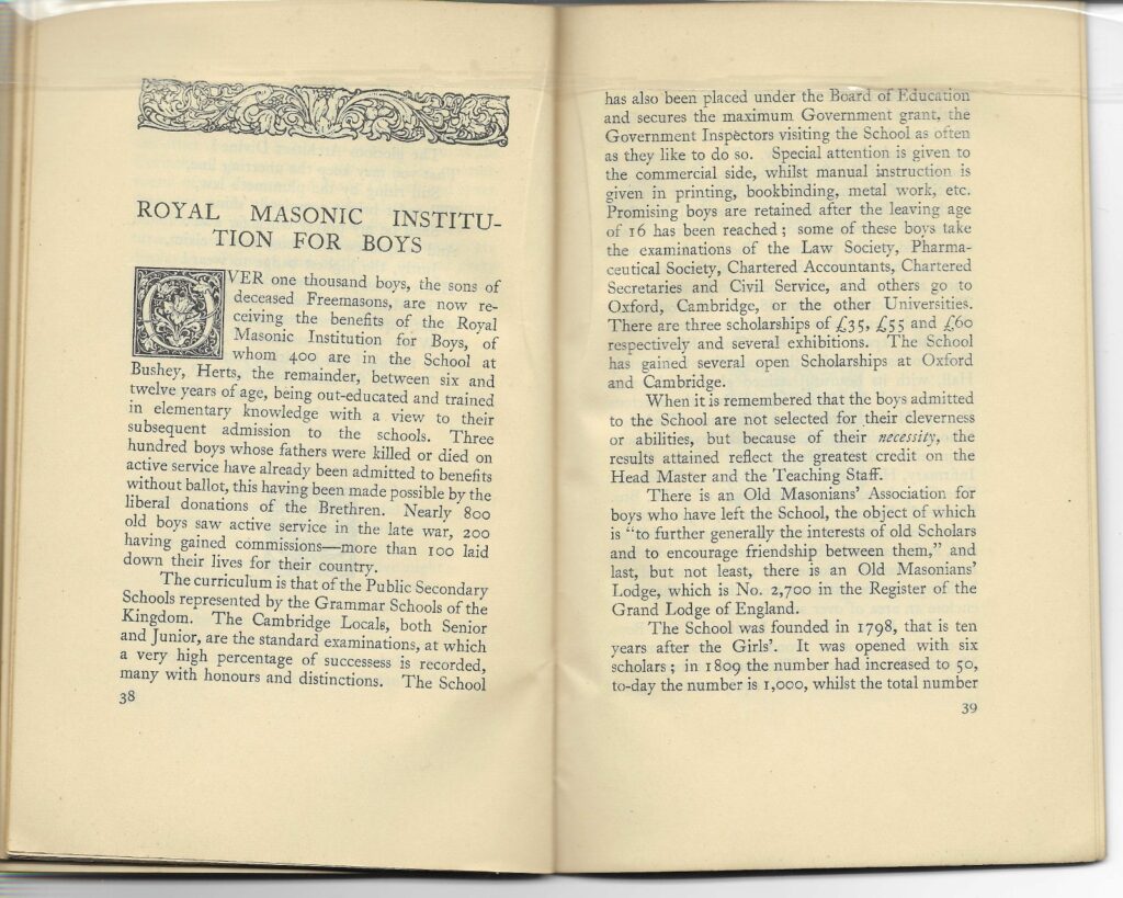 ROYAL MASONIC INSTITUTION FOR BOYS Over one thousand boys, the sons of deceased Freemasons, are now receiving the benefits of the Royal Masonic Institution for Boys, of whom 400 are in the School at Bushey, Herts, the remainder, between six and twelve years of age, being out-educated and trained in elementary knowledge with a view to their subsequent admission to the schools. Three hundred boys whose fathers were killed or died on active service have already been admitted to benefits without ballot, this having been made possible by the liberal donations of the Brethren. Nearly 800 old boys saw active service in the late war, 200 having gained commissions — more than 100 laid down their lives for their country.