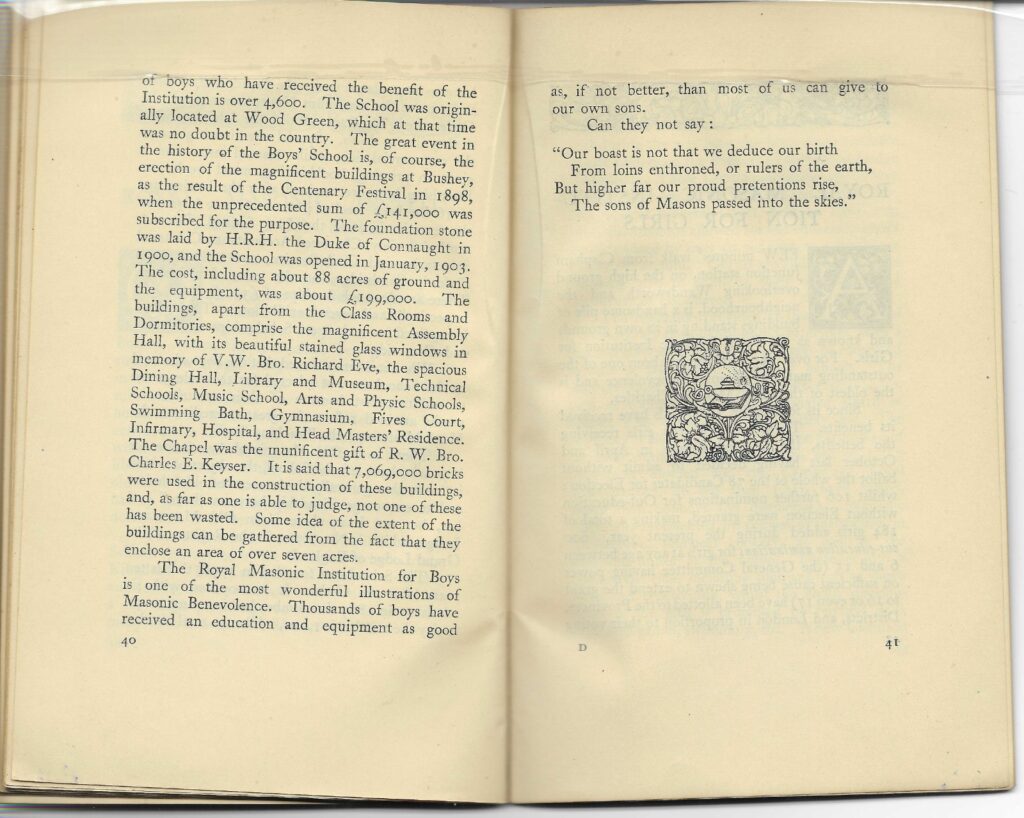 The Royal Masonic Institution for Boys is one of the most wonderful illustrations of Masonic Benevolence. Thousands of boys have received an education and equipment as good as, if not better, than most of us can give to our own sons.