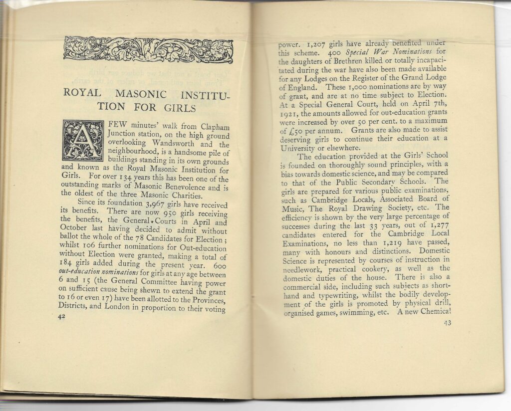 Few minutes’ walk from Clapham Junction station, on the high ground overlooking Wandsworth and the neighbourhood, is a handsome pile of buildings standing in its own grounds and known as the Royal Masonic Institution for Girls. For over 134 years this has been one of the outstanding marks of Masonic Benevolence and is the oldest of the three Masonic Charities.