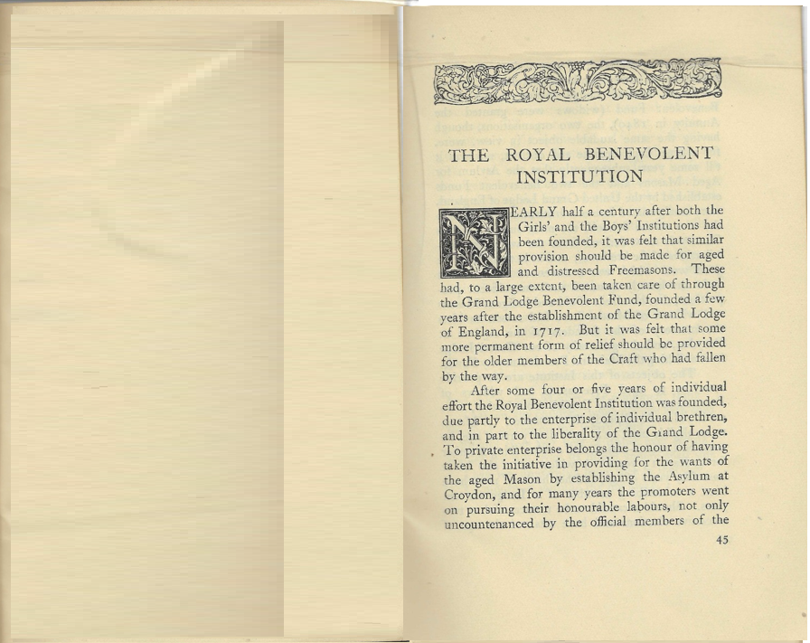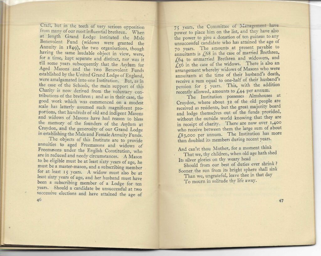 After some four or five years of individual effort the Royal Benevolent Institution was founded, due partly to the enterprise of individual brethren, and in part to the liberality of the Grand Lodge. To private enterprise belongs the honour of having taken the initiative in providing for the wants of the aged Mason by establishing the Asylum at Croydon, and for many years the promoters went on pursuing their honourable labours, not only uncountenanced by the official members of the Craft, but in the teeth of very serious opposition from many of our most influential brethren.When at length Grand Lodge instituted the Male Benevolent Fund (widows were granted the Annuity in 1849), the two organisations, though having the same laudable object in view, were, for a time, kept separate and distinct, nor was it till some years subsequently that the Asylum for Aged Masons and the two Benevolent Funds established by the United Grand Lodge of England were amalgamated into one Institution. But, as in the case of the Schools, the main support of this Charity is now derived from the voluntary contributions of the brethren; and as in their case, the good work which was commenced on a modest scale has latterly assumed such magnificent proportions, that hundreds of old and indigent Masons and widows of Masons have had reason to bless the memory of the founders of the Asylum at Croydon, and the generosity of our Grand Lodge in establishing the Male and Female Annuity Funds.