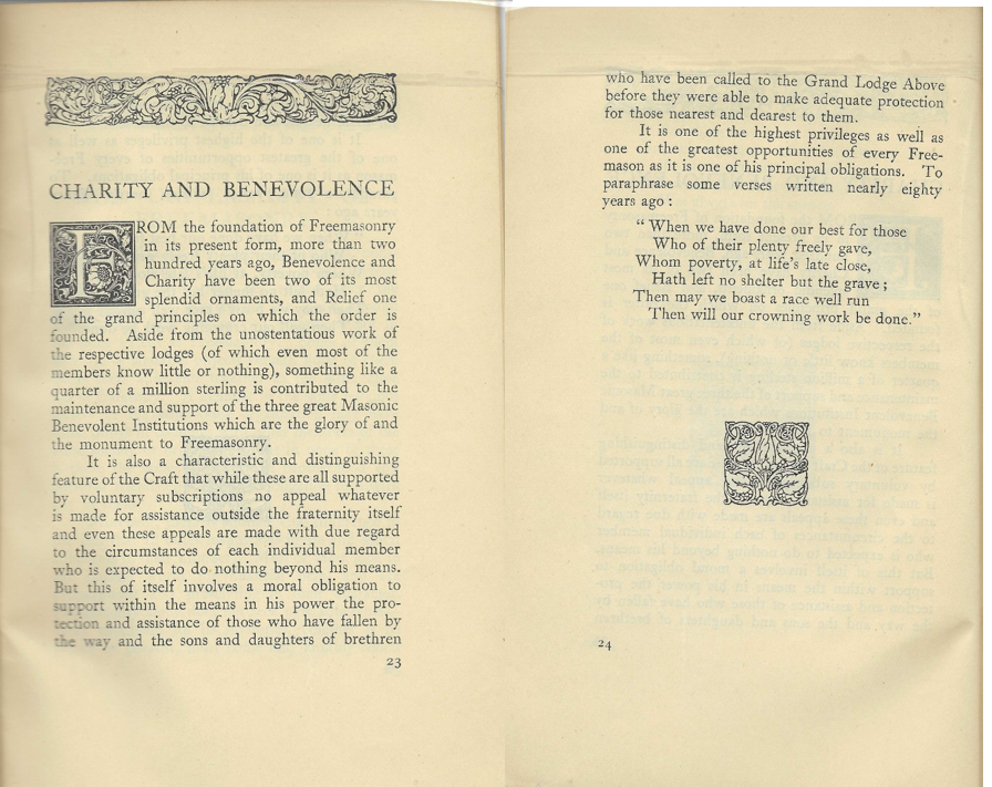 It is also a characteristic and distinguishing feature of the Craft that while these are all supported by voluntary subscriptions no appeal whatever is made for assistance outside the fraternity itself and even these appeals are made with due regard to the circumstances of each individual member who is expected to do nothing beyond his means. But this of itself involves a moral obligation to sepport within the means in his power the protection and assistance of those who have fallen by the wey and the sons and daughters of brethren who have been called to the Grand Lodge Above before they were able to make adequate protection for those nearest and dearest to them. :