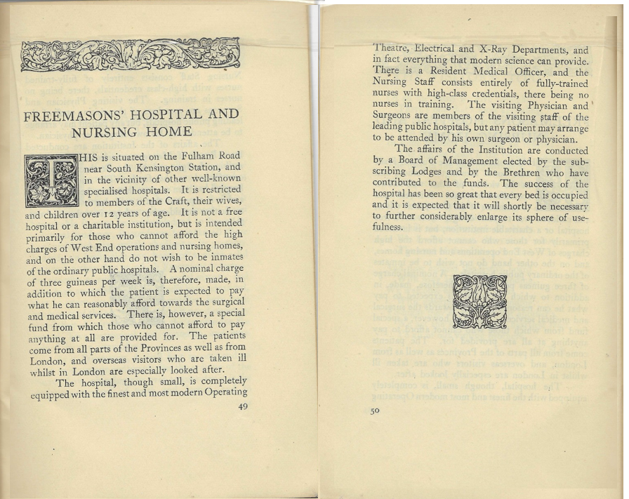 This is situated on the Fulham Road near South Kensington Station, and in the vicinity of other well-known specialised hospitals. It is restricted to members of the Craft, their wives, and children over 12 years of age. It is not a free hospital or a charitable institution, but is intended primarily for those who cannot afford the high charges of West End operations and nursing homes, and on the other hand do not wish to be inmates of the ordinary public hospitals. A nominal charge of three guineas per week is, therefore, made, in addition to which the patient is expected to pay what he can reasonably afford towards the surgical and medical services. There is, however, a special fund from which those who cannot afford to pay anything at all are provided for. The patients come from all parts of the Provinces as well as from London, and overseas visitors who are taken ill whilst in London are especially looked after.