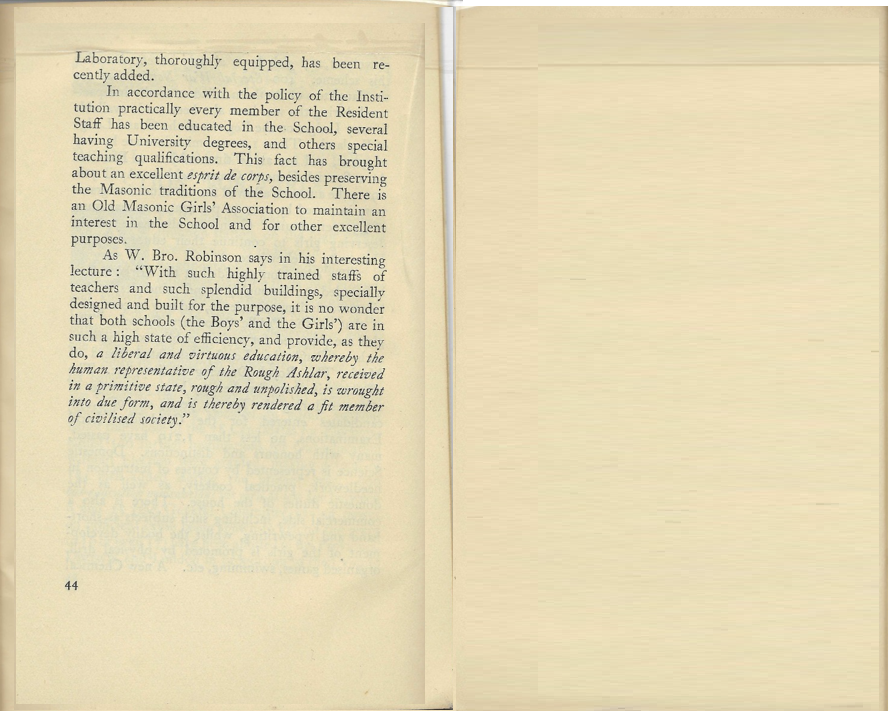 As W. Bro. Robinson says in his interesting lecture: “With such highly trained staffs of teachers and such splendid buildings, specially designed and built for the purpose, it is no wonder that both schools (the Boys’ and the Girls’) are in such a high state of efficiency, and provide, as they do, a liberal and virtuous education, whereby the human representative of the Rough Ashlar, received in a primitive state, rough and unpolished, is wrought into due form, and is thereby rendered a fit member of civilised society.”