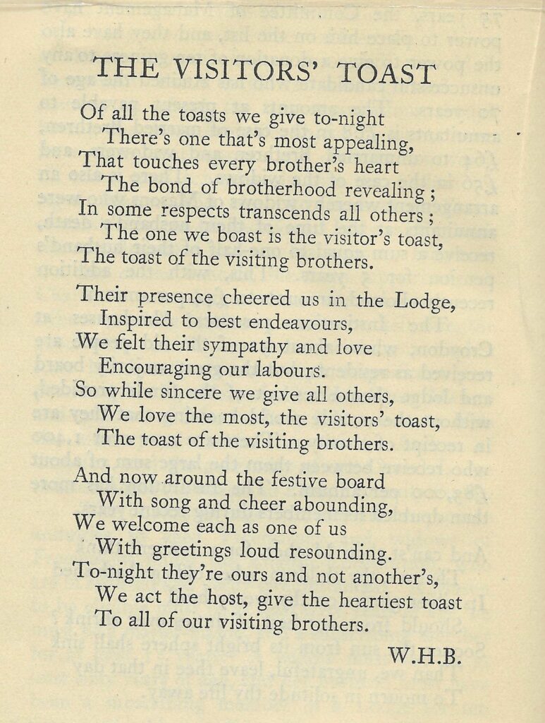 Around the festive board, in fellowship and good cheer, we welcome them as one of us. As hosts, we gladly offer the visitor’s toast — a sincere tribute to the unity, goodwill, and living fraternity that we share as brethren wherever we may meet.: