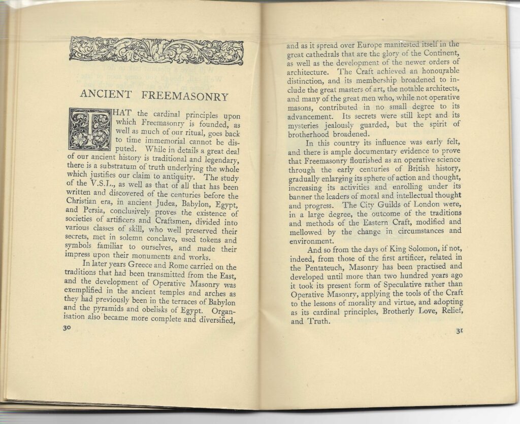 THAT the cardinal principles upon which Freemasonry is founded as well as much of our ritual, goes back to time immemorial cannot be disputed. While in details a great deal of our ancient history is traditional and legendary, there is a substratum of truth underlying the whole which justifies our claim to antiquity. The study of the V.S.L., as well as that of all that has been written and discovered of the centuries before the Christian era, in ancient Judea, Babylon, Egypt, and Persia, conclusively proves the existence of societies of artificers and Craftsmen, divided into various classes of skill, who well preserved their secrets, met in solemn conclave, used tokens and symbols familiar to ourselves, and made their impress upon their monuments and works,