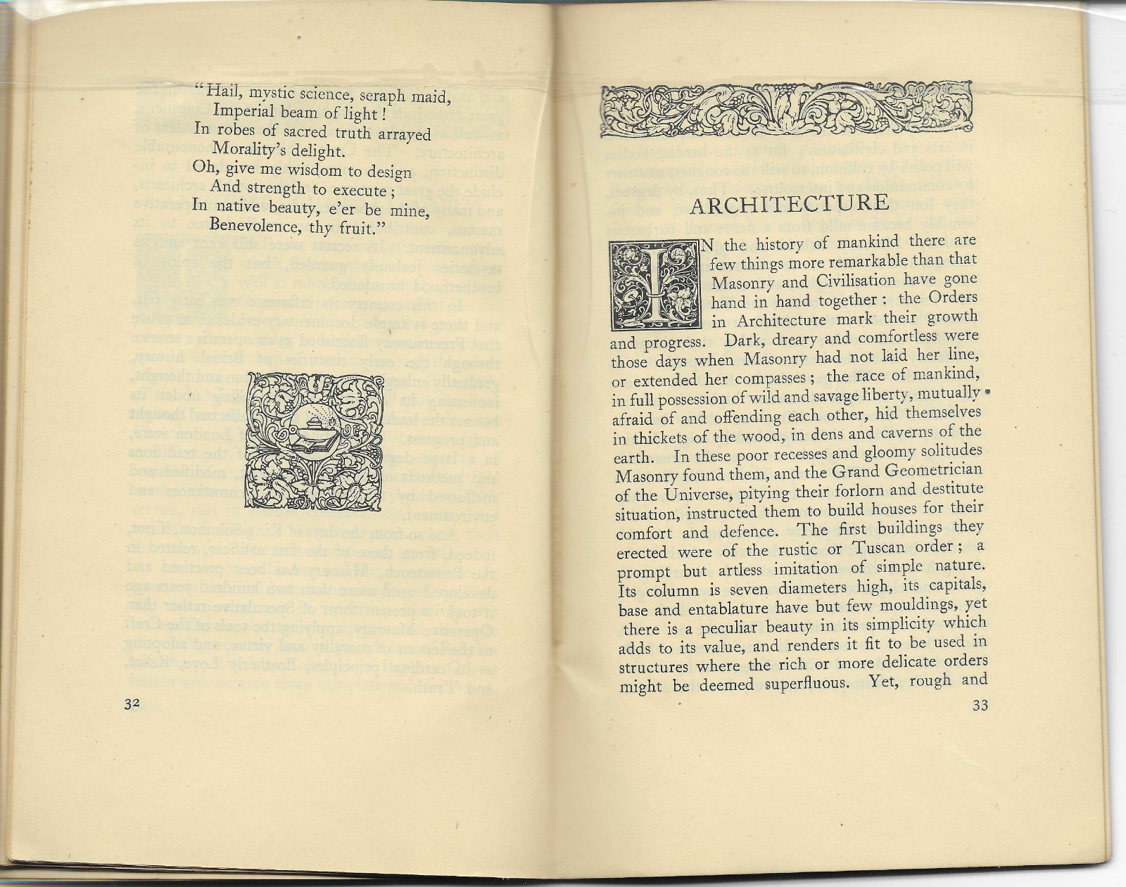 Throughout history, Masonry and civilisation have advanced together, reflected in the development of the architectural Orders. In humanity’s earliest, savage state, people lived in forests and caves until Masonry, guided by the “Grand Geometrician of the Universe,” inspired them to build for shelter and security. The first structures were simple and rustic, represented by the Tuscan Order—plain, strong, and natural—yet they fostered community, refinement, and social progress.