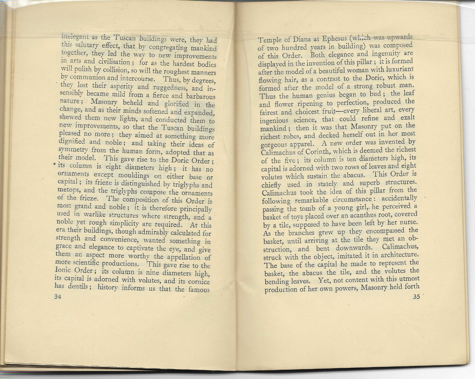 Yet, rough, and inelegant-as the Tuscan buildings were, they had this salutary effect, that by congregating mankind together, they led the way to new improvements in arts and civilisation ; for as the hardest bodies will polish by collision, so will the roughest manners by communion and intercourse. Thus, by degrees, ‘they lost their asperity and ruggedness, and insensibly became mild from a fierce and barbarous nature; Masonry beheld and glorified in the change, and as their minds softened and expanded, shewed them new lights, and conducted them to new improvements, so that the ‘Tuscan buildings pleased no more; they aimed at something more dignified and noble; and taking their ideas of symmetry from the human form, adopted that as their model. This gave rise to the Doric Order ;  its column is eight diameters high; it has no ornaments except mouldings on either base or : capital ; its frieze is distinguished by triglyphs and metops, and the triglyphs compose the ornaments of the frieze. The composition of this Order is most grand and noble; it is therefore principally used in warlike structures where strength, and a noble yet rough simplicity are required. At this era their buildings, though admirably calculated for strength and convenience, wanted something in grace and elegance to captivate the eye, and give them an aspect more worthy the appellation of more scientific productions. This gave rise to the Ionic Order; its column is nine diameters high, its capital is adorned with volutes, and its cornice has dentils; history informs us that the famous ‘Temple of Diana at Ephesus (which-was upwards of two hundred years in building) was composed of this Order.