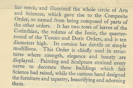 Yet, not content with this utmost production of her own powers, Masonry held forth her torch, and illumined the whole circle of Arts and Sciences, which gave rise to the Composite Order, so named from being composed of parts of the other orders. It has two rows of leaves of the Corinthian, the volutes of the Tonic, the quarterround of the Tuscan and Doric Orders, and is ten diameters high. Its cornice has dentils or simple modillions. This Order is chiefly used in structures where strength, elegance and beauty are displayed. Painting and Sculpture strained every nerve to decorate these buildings which fair Science had raised, while the curious hand designed the furniture and tapestry, beautifying and adorning them.